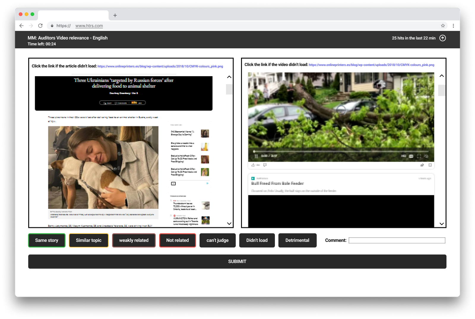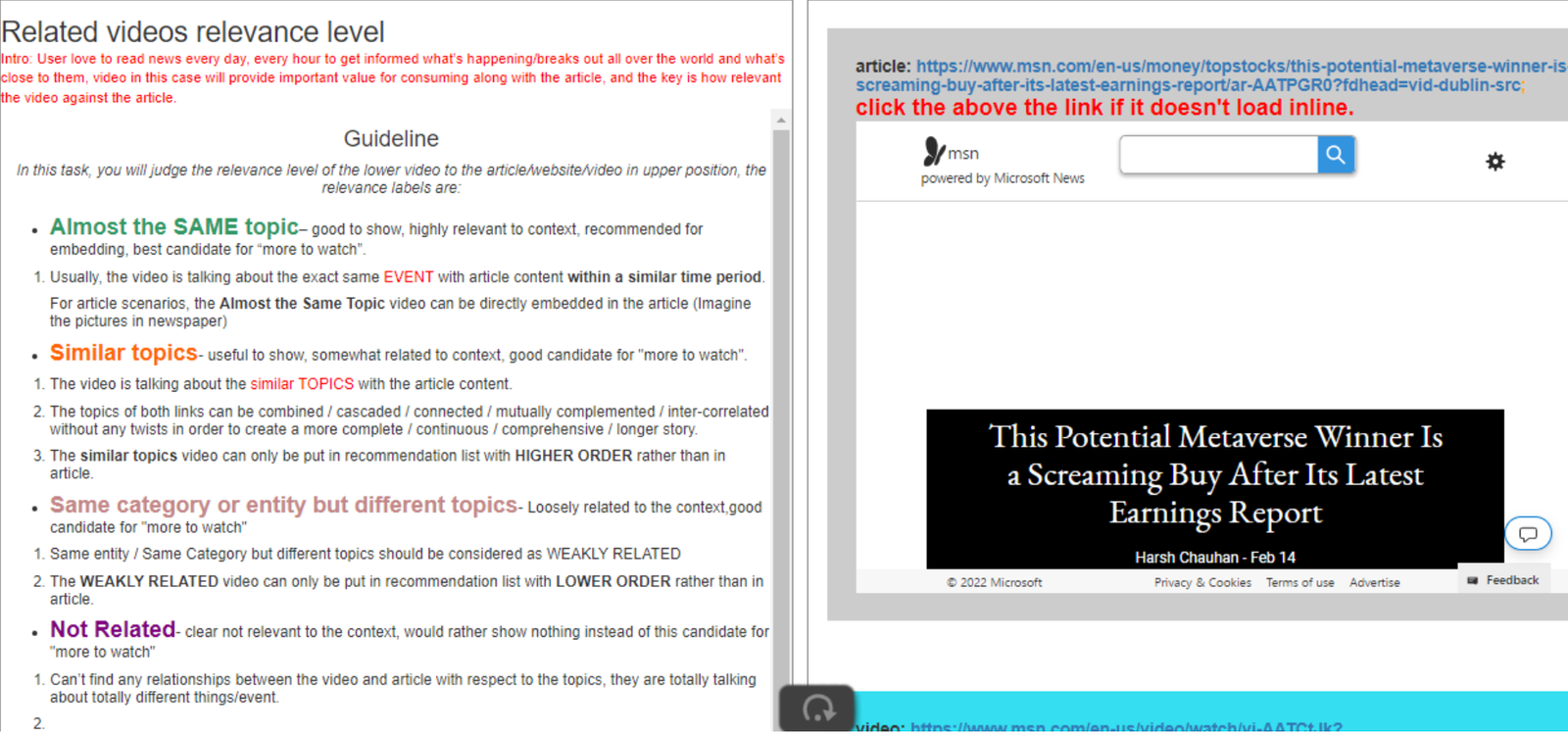 Microsoft’s Bing AI team needed high-quality labeled data to train machine learning models for video recommendation systems. Human evaluators (called “judges”) used a platform called HITapp to assess whether videos were relevant to news articles—a critical task for improving content recommendation accuracy.